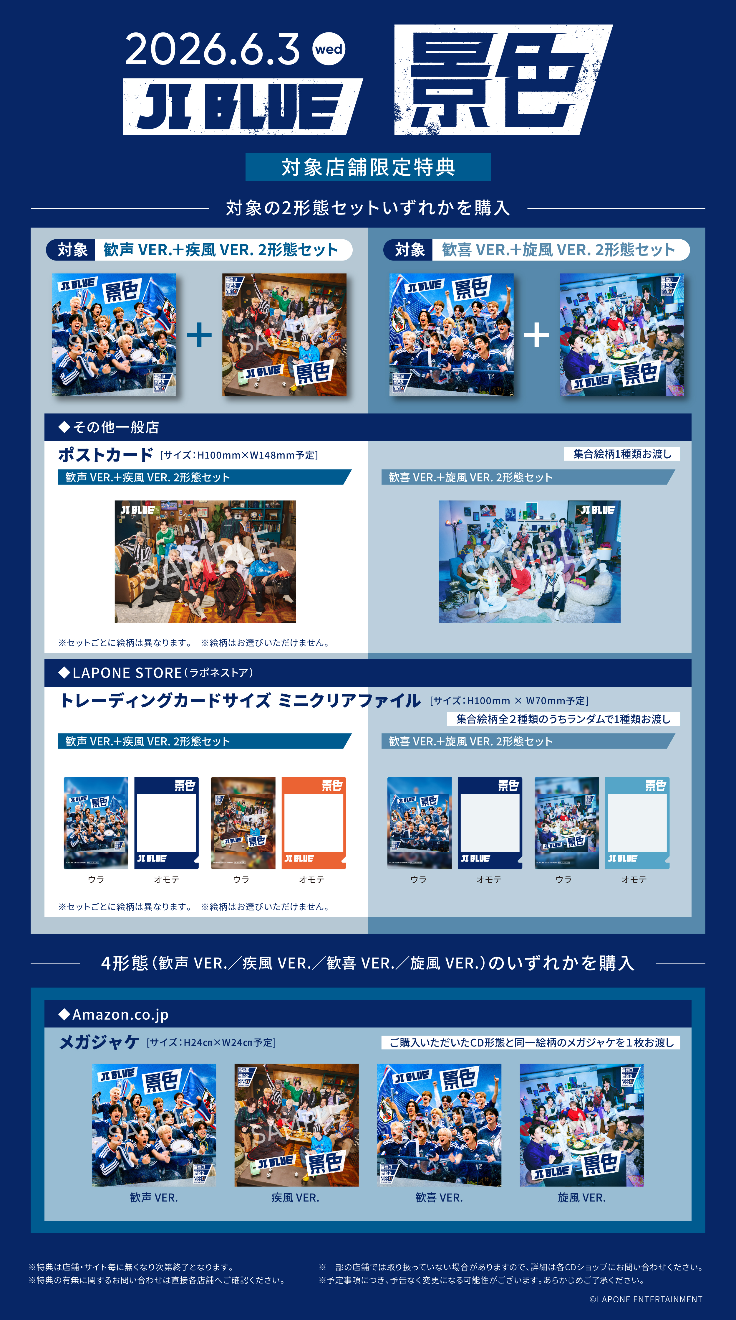 2026年6月3日(水)発売 JI BLUE SINGLE『景色』(歓声 VER./疾風 VER./歓喜 VER./旋風 VER.)を対象店舗にてご予約(ご購入)いただくと、下記の先着特典をプレゼントいたします。いずれの特典もなくなり次第終了となりますので、お早めにご予約ください。